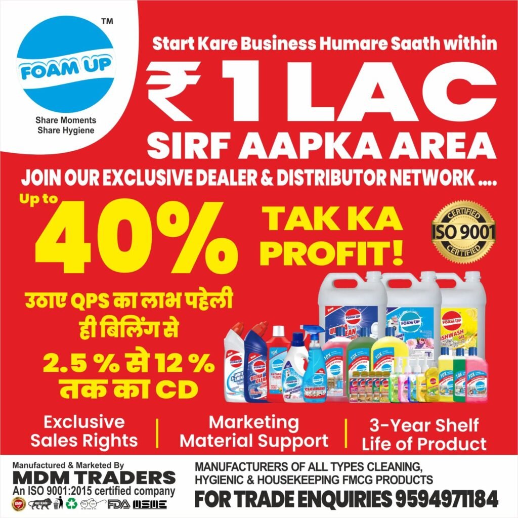 Foam-up Hygienic Products started its journey in 2013 with a clear vision: to excel in the field of cleaning and hygienic chemicals by delivering high quality at low cost. Our two foundation pillars are: High Quality Standards (from industrial cleaning to hospitality care) Affordable Pricing (without compromising performance) We are proud to serve Industrial, Hospitality, Commercial, and FMCG Retail Sectors with effective cleaning solutions that promote cleanliness and hygiene in every space. Today, FOAMUP offers more than 33 products under one brand, making us a one-stop solution for cleaning & hygiene for distributors, suppliers, and retailers.